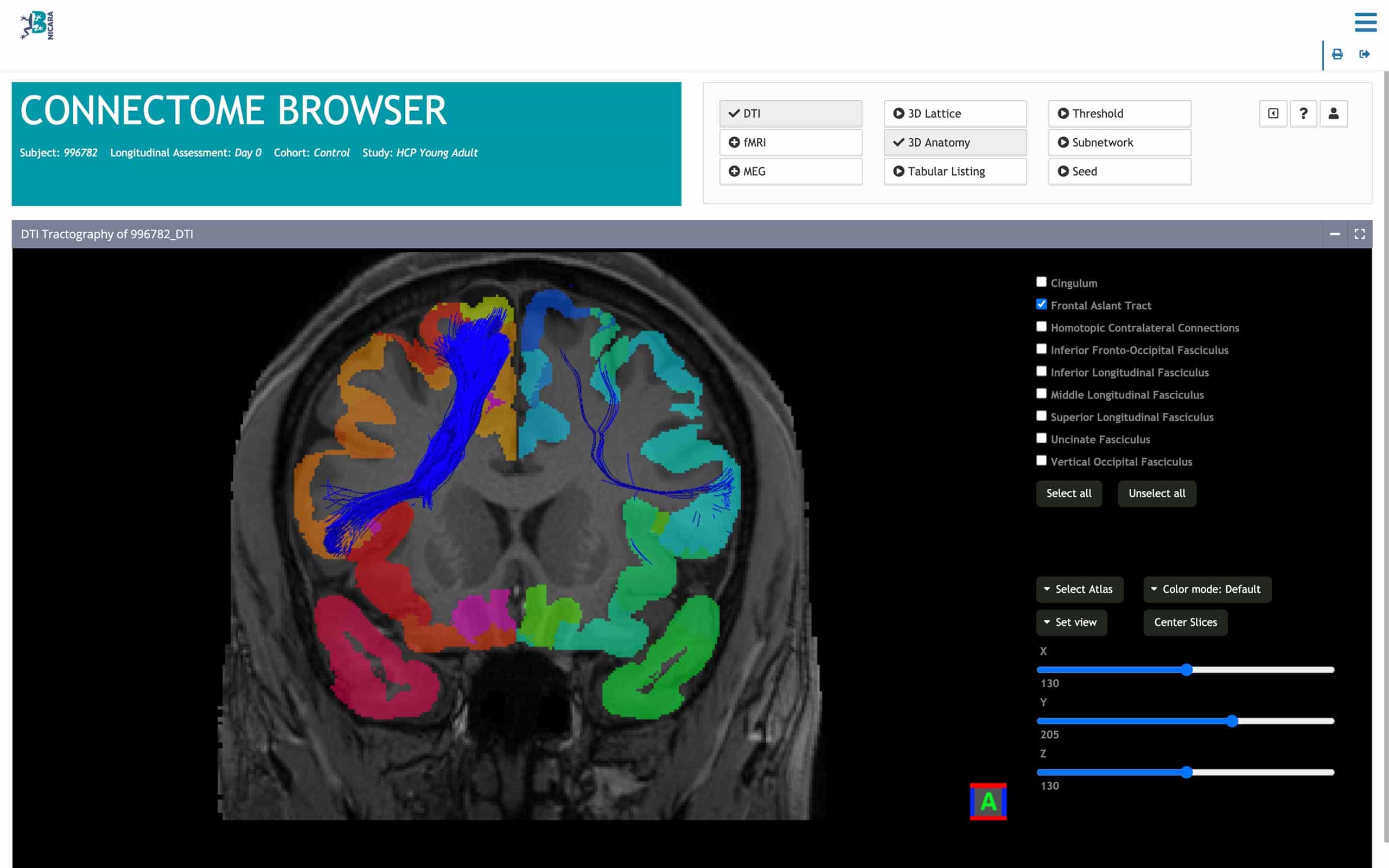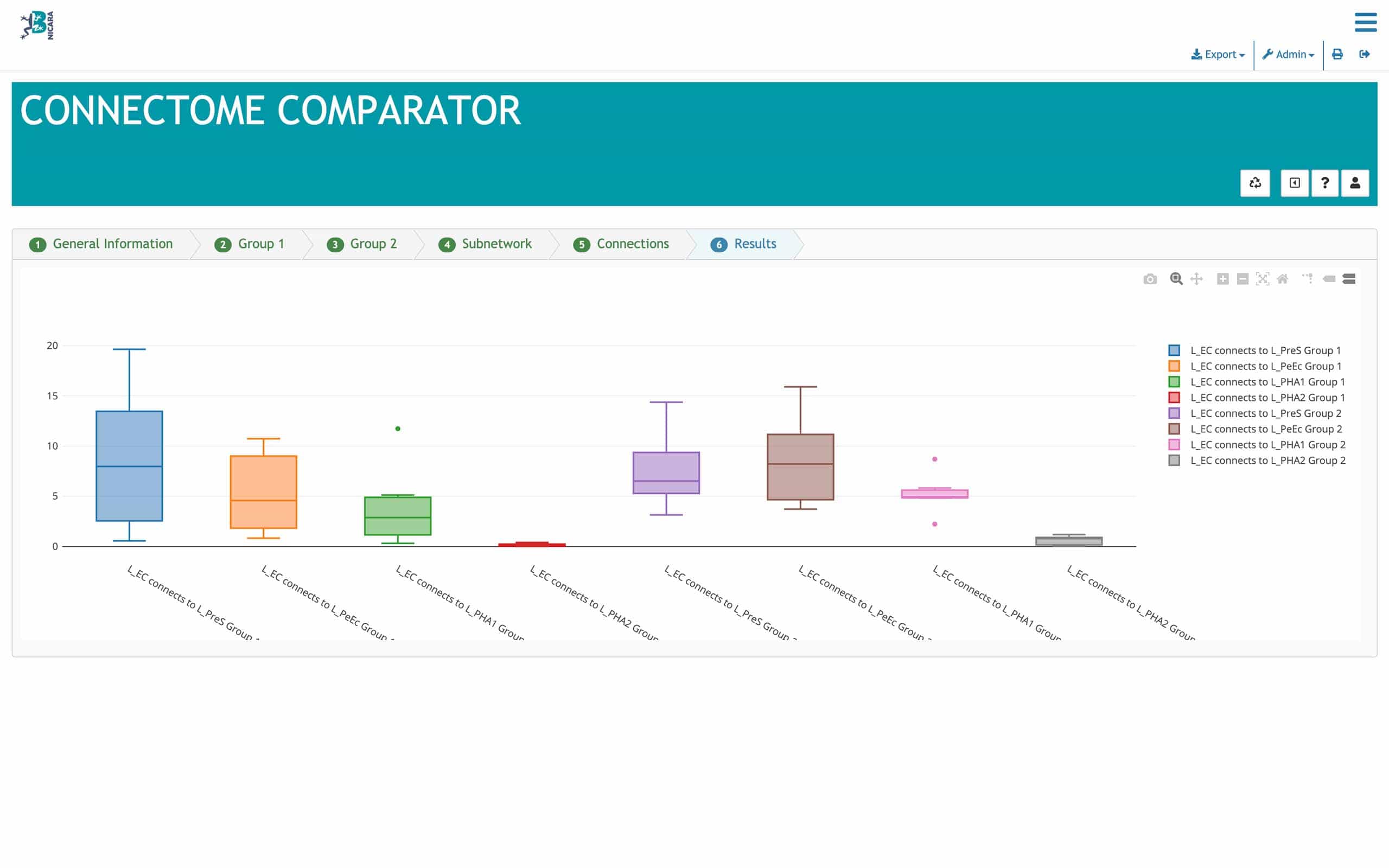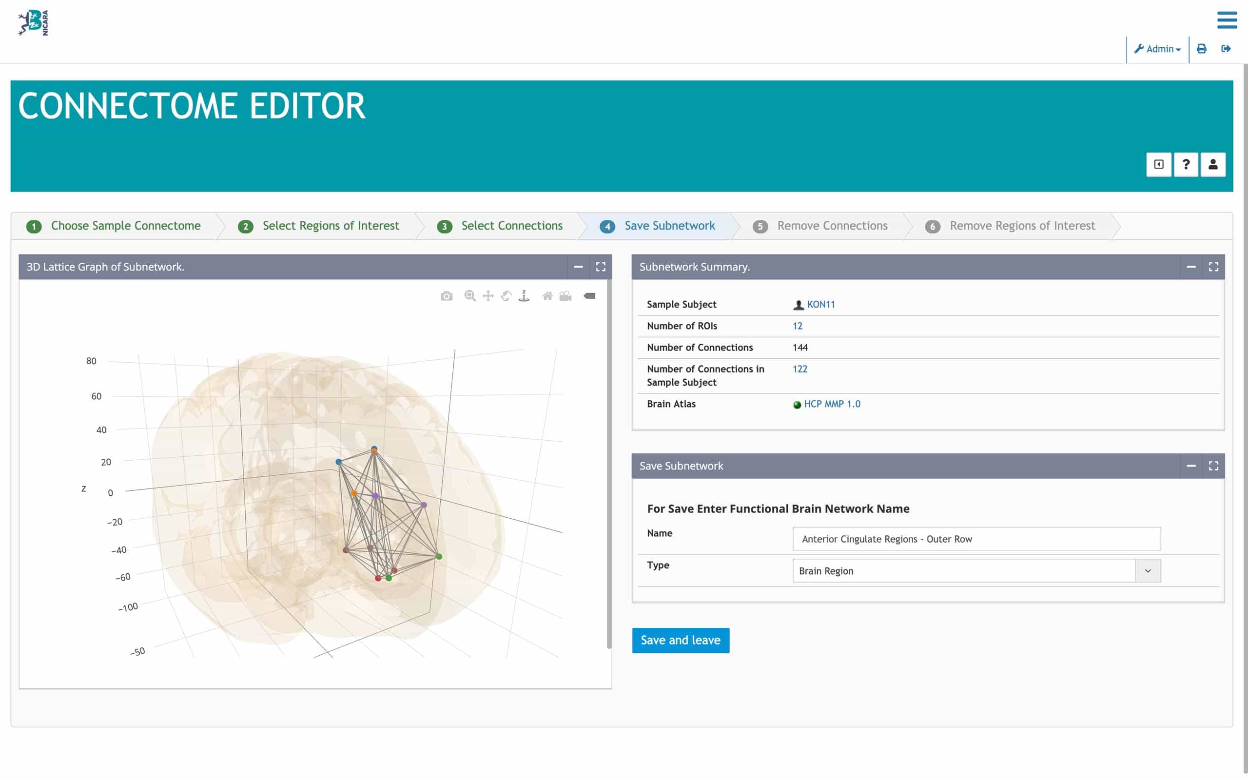 The Connectome Editor of NICARA helps you explore, analyze and compare connectivity of selected anatomical and functional subnetworks.